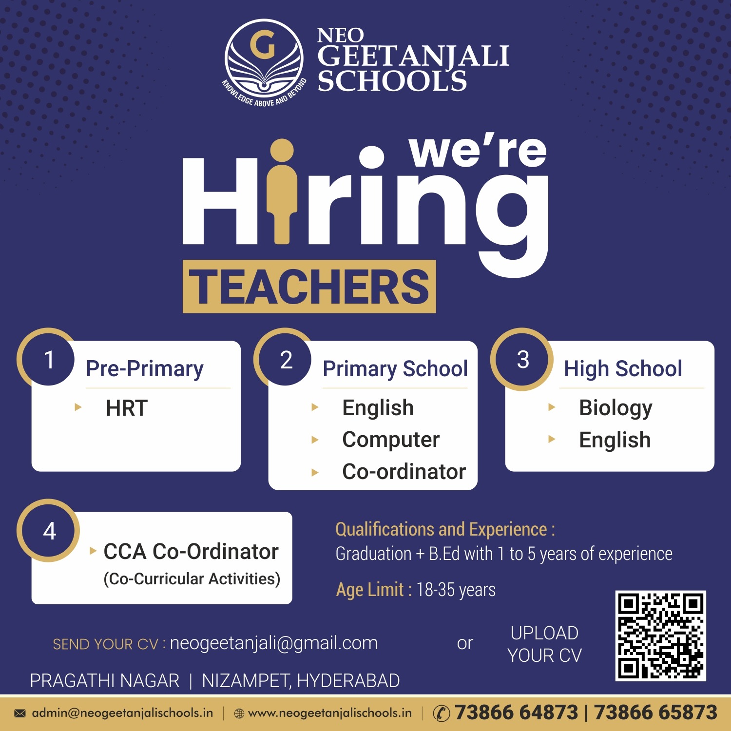 Founded in 2022, Neo Geetanjali Schools in Pragathi Nagar and Nizampet, Hyderabad, offers quality education from Nursery to Class X. Located near Jagan Studio, the school emphasizes innovative teaching and upholds core values like Respect, Responsibility, and Integrity.