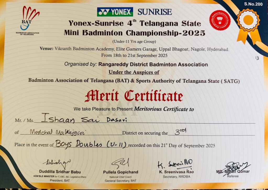 We are delighted to share that Dasari Ishaan Sai of Grade IV, Neo Geetanjali School, has made us proud by clinching the 🥉 Bronze Medal in the Yonex-Sunrise Telangana State Badminton Championship – 2025 under the U–11 Boys Doubles Category! 🏸